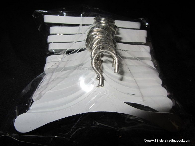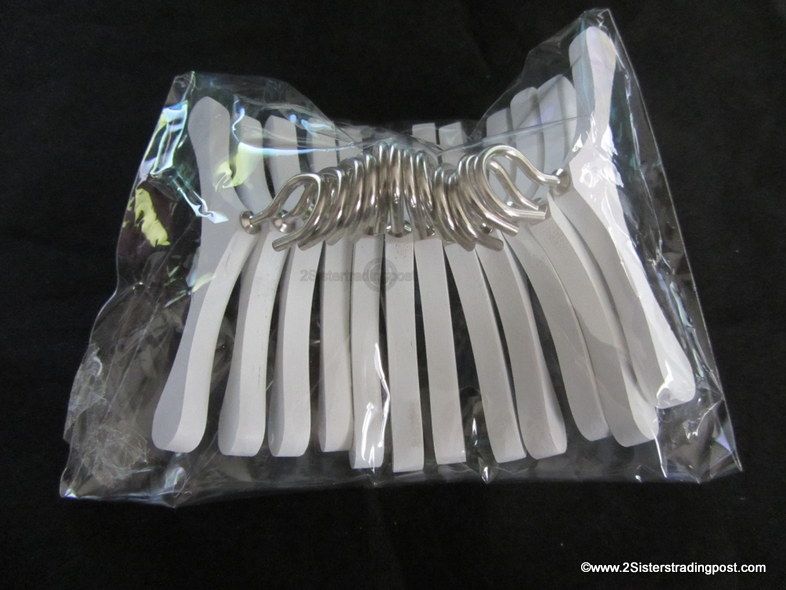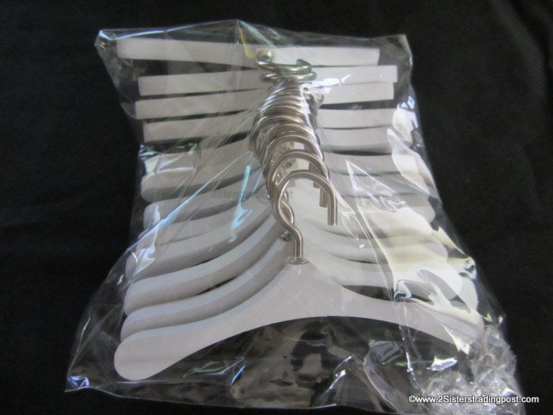 Hangers are wooden with a metal hook to hang it up by. Hangers measure approx. 9cm or 3.25"