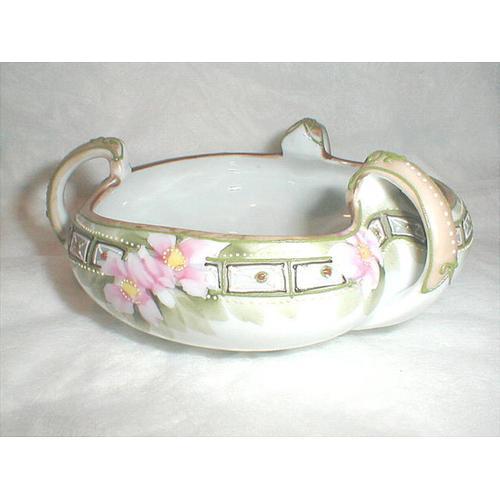 FOR SALE IS A BEAUTIFUL NIPPON 3 HANDLED BOWL THAT IS JEWELED AND MORIAGE AND IS IN VERY GOOD CONDITION WITH NO CHIPS, CRACKS, CRAZING OR REPAIRS. <P> THIS BOWL MEASURES 2 1/2 IN. TALL AND 5 1/2 IN. IN DIAMETER AND HAS LOVELY PINK FLOWERS WITH YELLOW CENTERS, GREEN LEAVES AND JEWELING AND MORIAGE ALONG THE HANDLES AND DECORATED EDGES.