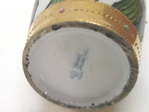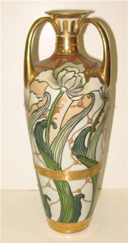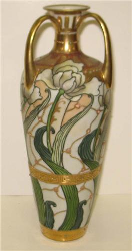 NIPPON TRIPLE-HANDLED BUD VASE. Decorated with hand painted floral and jeweled gilt and enameled decoration. Marked on bottom with blue Nippon maple leaf mark. 11” H