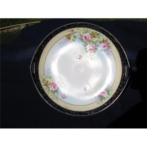 GORGEOUS HAND PAINTED NIPPON CAKE PLATE FEATURING CLUSTERS OF PINK AND YELLOW ROSES. THE ROSES ARE BEAUTIFULLY PAINTED AND ARE CONTRASTED