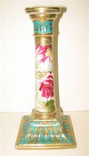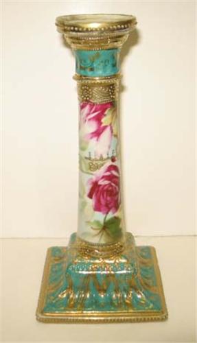 NIPPON CANDLESTICK. Hand painted floral rose and jeweled gilt decoration on stem and base. Shows some loss to gilt. Marked on bottom with green Nippon maple leaf mark. 9” H