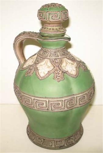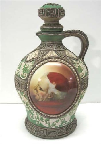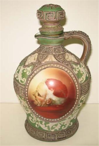 NIPPON ROMAN CATHOLIC CARDINAL DECORATED HANDLED DECANTER. Elaborate moriage enameled decoration around body and stopper. Hand painted portrait of Roman Catholic Cardinal on body. Portrait shows a series of tight hairline cracks. Stopper has cork bottom. Marked with blue Nippon maple leaf mark on bottom. 9.5” H