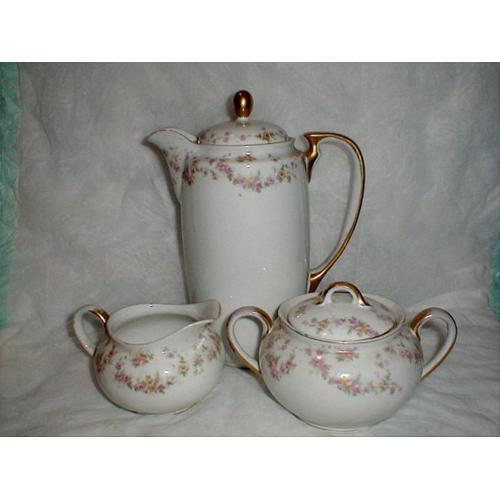 HERE IS A LOVELY CHOCOLATE POT SET WHICH INCLUDES THE CREAM PITCHER AND COVERED SUGAR BOWL BY NIPPON. THE CHOCOLATE POT MEASURES 9 1/2 IN. TALL AND 7 IN. WIDE FROM SPOUT TO HANDLE. THE CREAM PITCHER MEASURES 3 1/4 IN. TALL AND 5 1/4 IN. WIDE FROM SPOUT TO HANDLE. THE SUGAR BOWL MEASURES 4 1/2 IN. TALL AND 6 3/4 IN. WIDE FROM HANDLE TO HANDLE.<P> ALL PIECES ARE IN VERY GOOD CONDITION WITH NO CHIPS, CRACKS, OR REPAIRS INCLUDING THE HAND PAINTED PINK FLOWERS WITH GREEN LEAVES ON A WHITE PORCELAIN BACKGROUND. THERE IS SOME LOSS TO THE GOLD ON THE HANDLES AND TRIM ON THE CREAM PITCHER AND SUGAR BOWL.