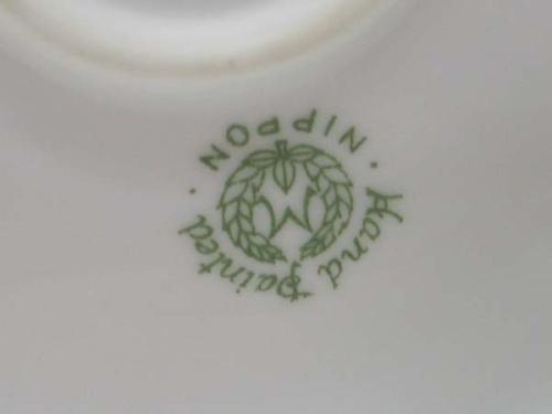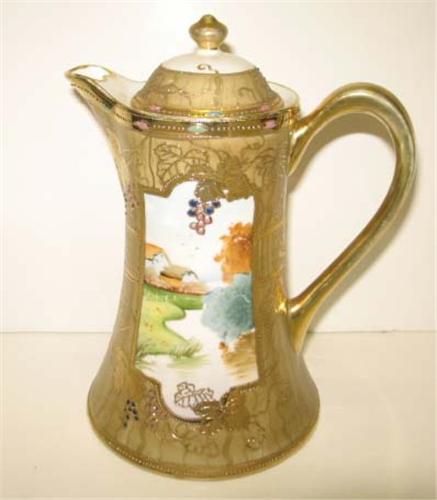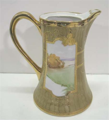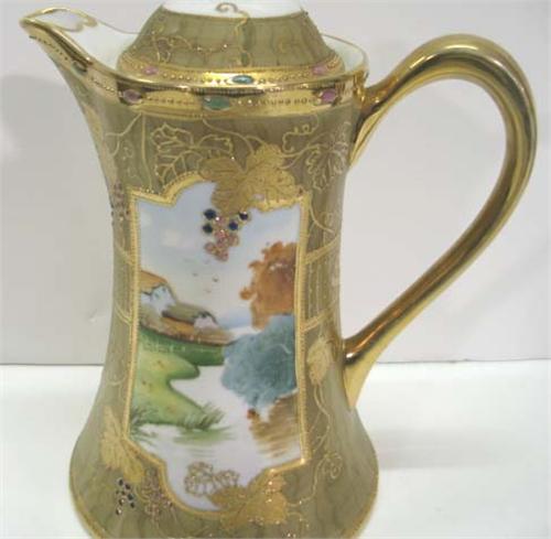 NIPPON CHOCOLATE POT. Jeweled gilt decoration around body with hand painted landscape scenes on both sides. Shows loss to gilt at handle. Large chip on inner top ridge of pot. Marked on bottom with Nippon green wreath mark. 8.75” H