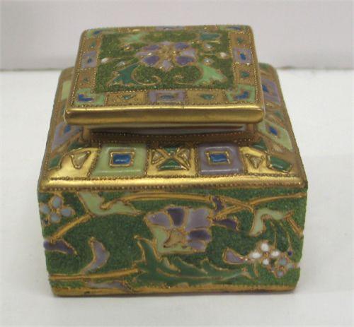 NIPPON CORALENE INKWELL WITH LID. Coralene and floral jeweled gilt decoration. Marked on bottom with green Nippon wreath mark. 2.5” H