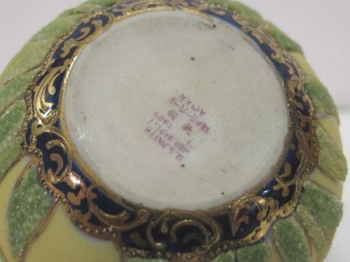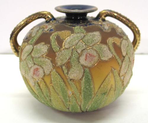 NIPPON CORALENE DOUBLE-HANDLED SQUAT VASE. Floral coralene decoration around body. Blue and jeweled gilt decoration at top and bottom. Shows loss to gilt. Marked on bottom with 1909 Japan mark. 2.75” H