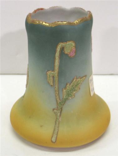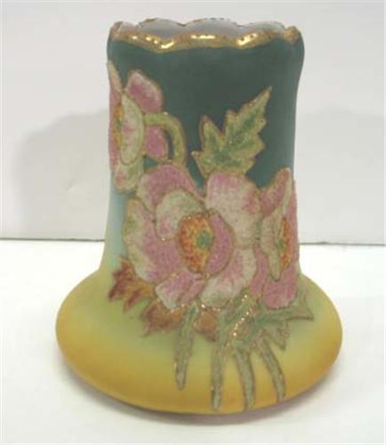 NIPPON CORALENE VASE. Pink floral coralene decoration around body. Gilt & jeweled decoration around top rim. Slight damage to two jewels at top rim. Marked with early 1909 Japanese mark on bottom. 4.75” H