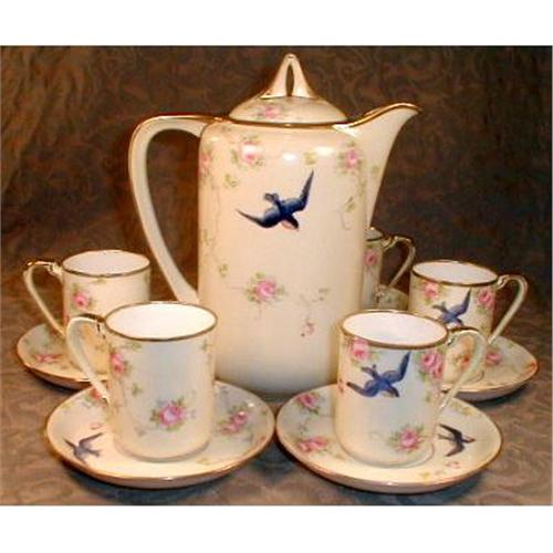 Beautiful Nippon chocolate set with hand painted Swallows or Blue Birds and flowers. Add this great set to your collection TODAY !</em></td>