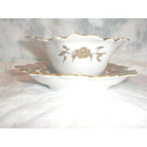 HERE IS A BEAUTIFUL GRAVY AND SAUCE DISH SET THAT IS IN VERY GOOD CONDITION WITH NO CHIPS, CRACKS, HAIRLINES OR REPAIRS. THE GRAVY DISH MEASURES 2 IN. TALL, 5 3/4 IN. IN LENGTH AND 4 1/2 IN. IN WIDTH. THE SAUCE DISH MEASURES 6 3/4 IN. LENGTH AND 5 3/4 IN. IN WIDTH. THE COLORS OF THIS SET ARE HEAVY WITH GOLD WITH TOUCHES OF A BLUSH PINK.