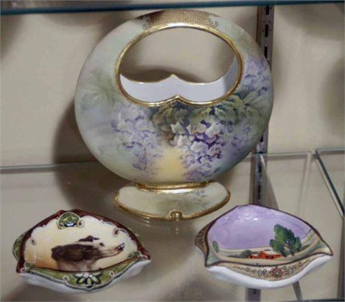"NIPPON GROUP 8 1/2"" tapestry basket and two painted small trays, excellent packing and shipping (excluding insurance) $50"