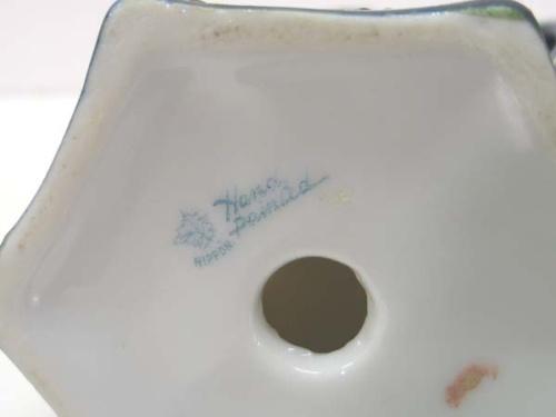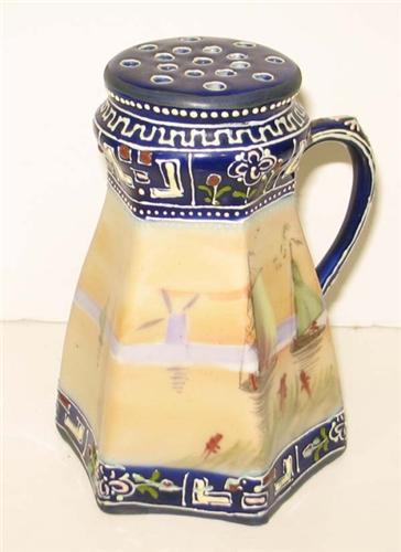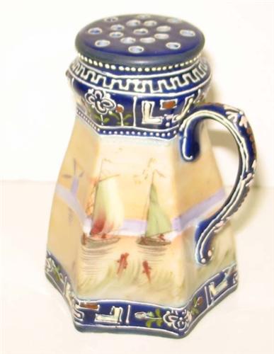 NIPPON HANDLED SHAKER. Decorated with hand painted water scene with boats. Also decorated with enameled decoration at top, bottom, and on handle. Marked on bottom with blue Nippon maple leaf mark. 5” H