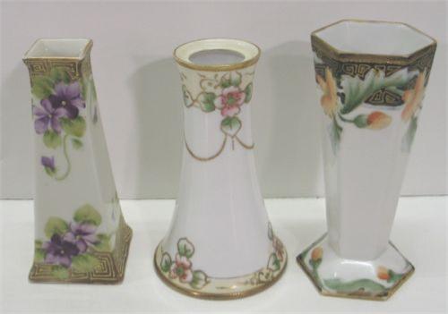 LOT OF THREE NIPPON HAT PIN HOLDERS. All are decorated with hand painted floral design. Two are also have jeweled gilt decoration. 5” H