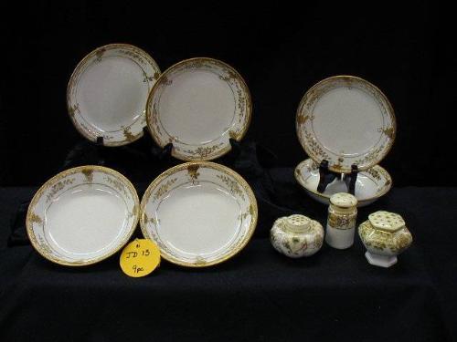 NIPPON HND PTD INCLUDES (6) 5 1/4in BOWLS OPEN WHITE FLOWER W/ GOLD RELIEF OUTLINE (1) SHAKER WHITE W/GOLD RELIEF DESIGN, (1) SHAKER WHITE W/GOLD RELIEF DESIGN (W/ BASE MFG FLAW), (1) SHAKER WHITE W/GOLD RELIEF DESIGN, 9 PC