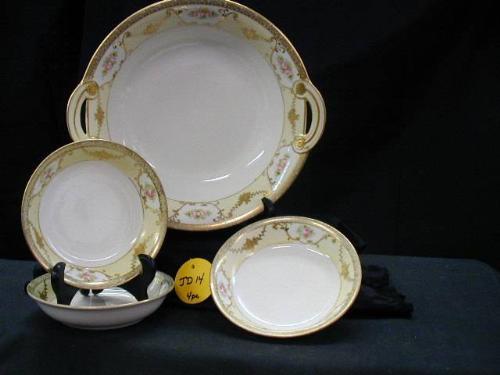 NIPPON M GREEN WREATH HND PTD BERRY BOWL SET INCLUDES (1) 10 1/2in SPREAD TAB HND BOWL PINK ROSES E/ GOLD RELIEF DESIGN EXCELLENT, (3) 5 1/4in BOWLS (1 W/RIM CHIPS & HAIRLINE), 4 PC