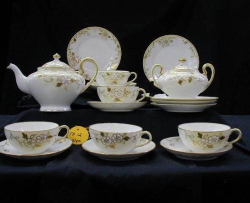 NIPPON M GREEN WREATH HND PTD FLORAL OPEN WHITE FLOWER W/ GOLD RELIEF OUTLINE INCLUDES (1) TEA POT, (1) COVERED SUGAR DBL HND., (6) SAUCERS, (6) PAPER THIN CUPS, (4) 6 1/2in PLATES, (3) 6 1/4in PLATES (SOME PLATES HAVE COLOR FADING) EXCELLENT, 21 PC