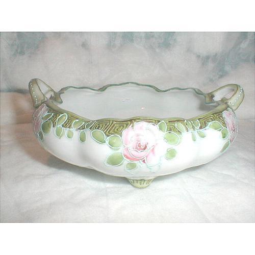 FOR SALE IS A BEAUTIFUL HAND PAINTED AND MORIAGE FOOTED BOWL THAT IS IN VERY GOOD CONDITION WITH NO CHIPS, CRACKS, HAIRLINES OR REPAIRS. THIS BOWL MEASURES 2 1/2 IN. TALL AND 6 IN. IN DIAMETER FROM HANDLE TO HANDLE AND HAS LOVELY COLORS OF SOFT PINK ROSES AROUND THE OUTSIDE EDGE WITH THE PINK AND DEEP ROSE INSIDE WITH GREEN LEAVES ON A WHITE PORCELAIN BACKGROUND.