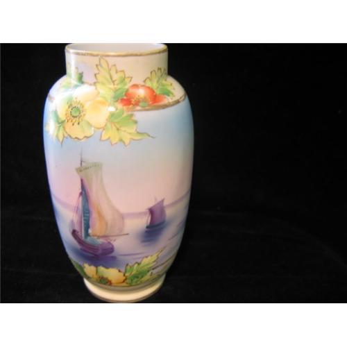 This beautiful Nippon vase is handpainted with a serene scene of a lake and sailboats, framed above and below with poppies and leaves in yellow and orange. The flowers are outlined with gold moriage, and gold beading rims the top and circles the vase above and below the lake scene, setting off the floral areas. The stamp on the bottom is blue, and it is signed with a gold character (see photo). The vase is in excellent condition: the moriage appears to all be intact; there are no chips or cracks. There is very slight wear on the gold trim at the top, and there are small areas on a gold band where the gold paint is thin or missing, apparently in the painting and not from wear. There are 2 "pimples" in the porcelain on the back. Also, on the back just above the sailboat, there is a 1/4 inch spot where it appears the orignal glaze was not applied and was later touched up.