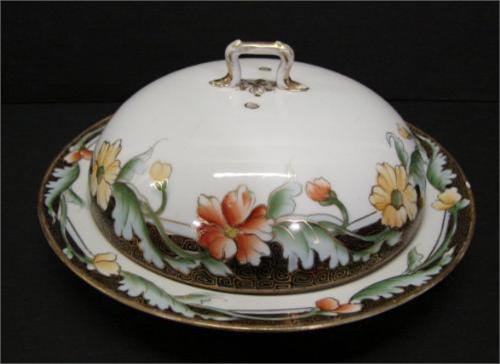NIPPON PORCELAIN PANCAKE DISH WITH LID. Hand painted floral decoration with gilt and black decorated geometric design. Shows some loss to gilt at handle on lid. Marked on bottom with Nippon blue leaf mark. 3.75” H, 8.5” Dia.
