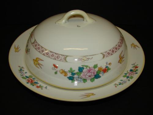 NIPPON PORCELAIN PANCAKE DISH WITH LID. Transfer decorated bird & floral decoration. Marked on bottom with Nippon lavender wreath mark. 4” H, 8.75” Dia.