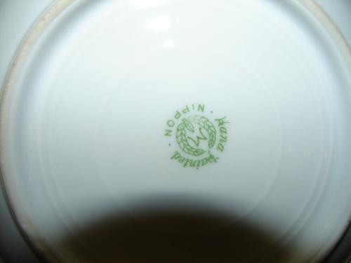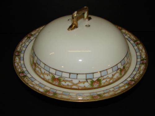 NIPPON PORCELAIN PANCAKE DISH WITH LID. Hand painted and gilt floral decorated with gilt jeweled decoration around border of plate and at bottom edge of lid. Shows some loss to gilt at handle at top of lid. Marked on bottom with Nippon green wreath mar