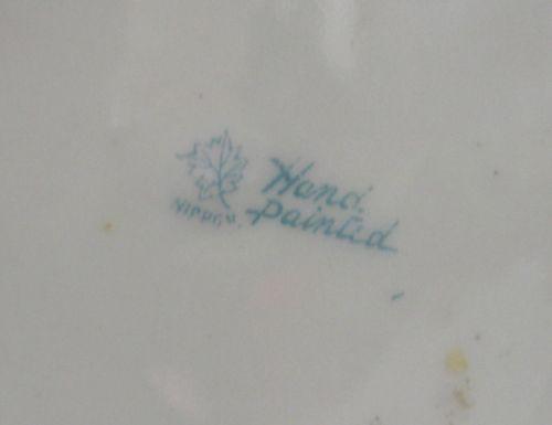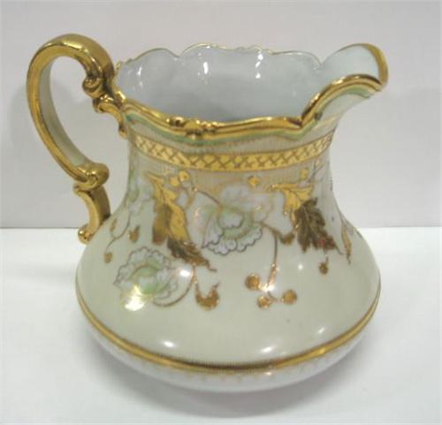 NIPPON PITCHER. Decorated with gilt and green floral and jeweled gilt decoration. Marked on bottom with blue Nippon maple leaf mark. 6” H