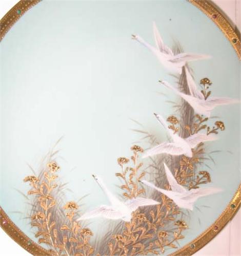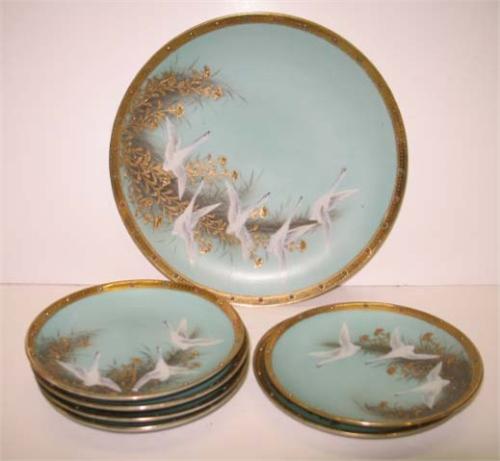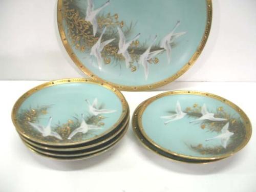 NIPPON SWAN DECORATED PLATE & SIX DISHES. Plate is decorated with five hand painted swans and jeweled gilt decoration. Plate is marked on reverse “Hand Painted-Made in Japan” with green leaf. 9.75” Dia. Dishes are decorated with three hand painted swans and jeweled gilt decoration. Some plates show minor loss to gilt. Four plates are marked “Hand Painted-Nippon” with green leaf and two are marked “Hand Painted-Made in Japan” with green leaf. 6” Dia. Each.