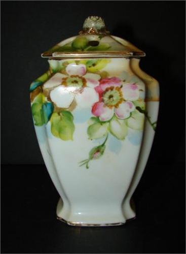 NIPPON, RISING SUN (1890-1921) PORCELAIN TOOTHBRUSH HOLDER WITH LID. Hand painted floral decorated body with lid that has reticulated slots and finial. Finial shows possible repair. Marked on bottom with Nippon blue rising sun mark. 5” H