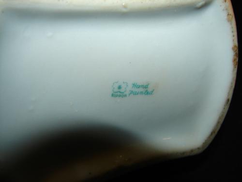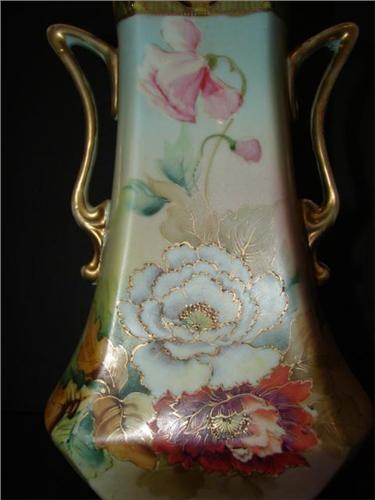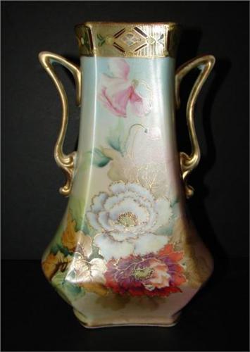 NIPPON PORCELAIN VASE. Hand painted floral decorated with gilt jeweled decoration. Vase has hand painted and gilt jeweled geometric design at top and gilt handles at both sides. Marked on bottom with Nippon green flower mark. 9.25” H
