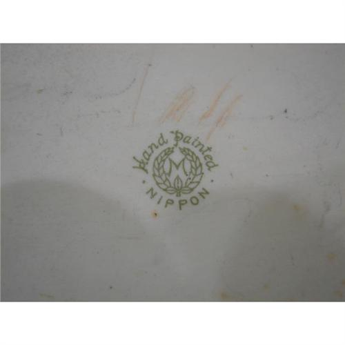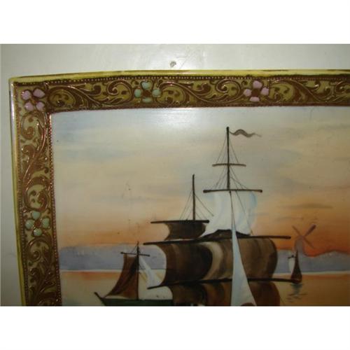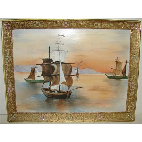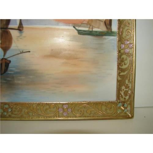 NIPPON PORCELAIN WALL HANGING. Decorated with a hand painted scene with ships on water. Gilt jeweled and enameled floral decoration around border. Shows some loss to gilt around border. Marked on back with Nippon green wreath mark. 8” x 10.5”.