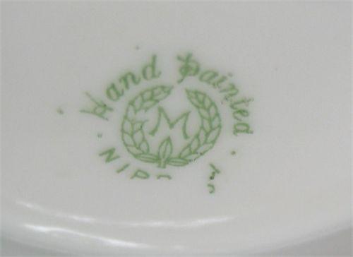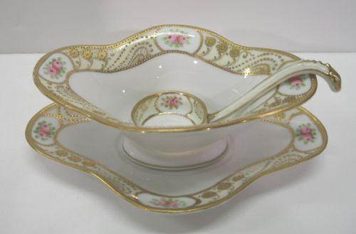 NIPPON SAUCE BOWL, UNDERTRAY, & LADLE. Floral and jeweled gilt decorated. Bowl and ladle are marked with green Nippon wreath mark. Undertray is not marked. 2.5” H
