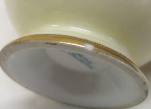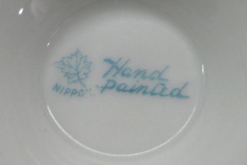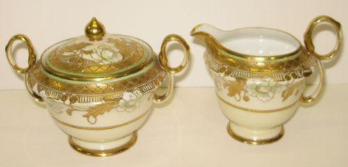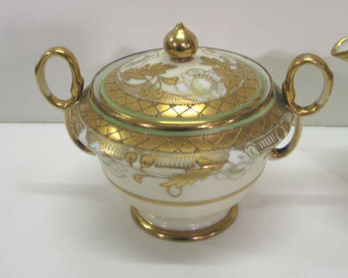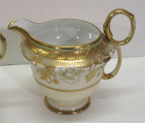 NIPPON SUGAR AND CREAMER. Both are decorated with green painted and jeweled gilt floral decoration. Both are marked with blue Nippon maple leaf mark on reverse. 4.5” H