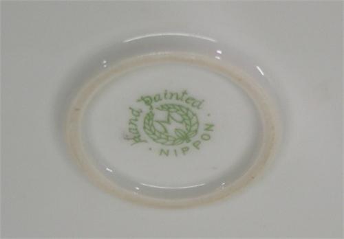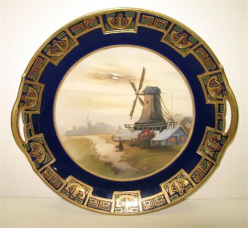 NIPPON DOUBLE-HANDLED TRAY. Cobalt and jeweled gilt decoration with portrait of Dutch windmill scene. Marked on reverse with green Nippon wreath mark. 10.25” Dia.