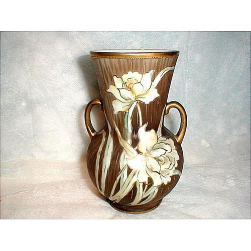 THIS IS A BEAUTIFUL VINTAGE HAND PAINTED VASE BY NIPPON THAT IS IN VERY GOOD CONDITION AS IS THE DESIGN AND GOLD TRIM. THIS VASE MEASURES 6 IN. TALL AND 4 1/2 IN. IN DIAMETER AND IS OF A COCOA BROWN BACKGROUND WITH WHITE FLOWERS AND LIGHT GREEN LEAVES ALL TRIMMED WITH GOLD AND GOLD HANDLES AND GOLD TRIM AT THE BASE AND AROUND THE OPENING.