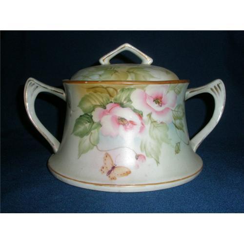 WE PRESENT TO YOU A NIPPON , HAND PAINTED AND GOLD GILT,BISKET JAR. SHOWING A HANDLED LID AND A DOUBLE HANDLED BODY. THIS NIPPON PIECE IS DECORATED WITH WILD ROSES, LEAVES AND A BUTTERFLY.THE BODY IS SHOWING A LIGHT BLUE AND GREEN BACKGROUND AND IS THEN PAINTED WITH THE WILD ROSES IN PINK AND WHITE TONES WITH A BUTTERFLY IN A YELLOW HUE. THE HANDLES ALL HAVE GOLD GILT AND THE TOP AND BOTTOM PERIMETER IS TRIMMED IN A EARTHTONE LIGHT BROWN. A LITTLE WEAR ON THE GILT AND ONE SPOT, AS SEEN IN THE PICTURES, ON THE RIM HAS A TOUCH OF PAINT MISSING. THE MARK ON THE BOTTOM IS THE ONE THAT HAS "HAND PAINTED NIPPON" AND TWO PEACOCKS WITH A "T" IN THE MIDDLE. THE INSIDE RIM AND THE RIM OF THE LID ARE NOT CHIPPED AT ALL, THIS PIECE WOULD BE CONSIDERED IN EXCELLENT CONDITION. THE BASE IS 6.5" DIAMETER,TOP IS 5" DIAMETER AND THE INSIDE IS 3" DEEP.