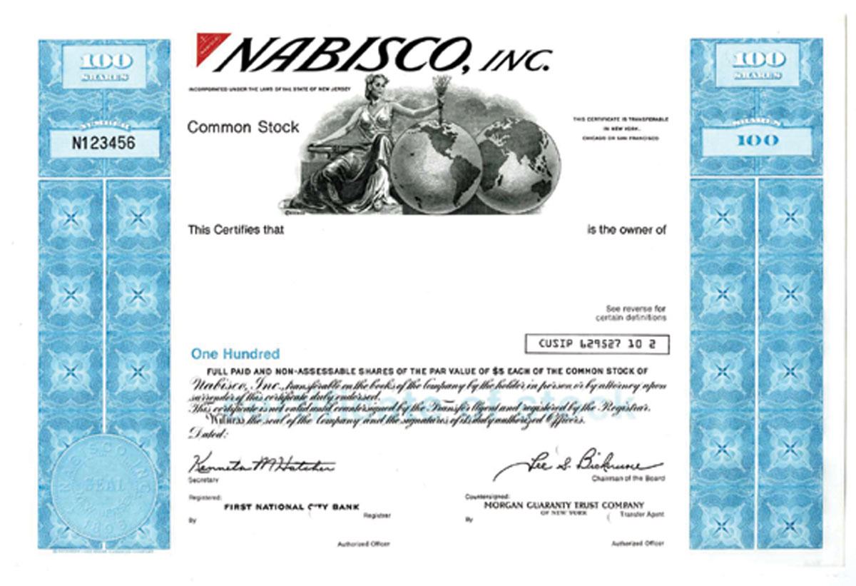 NJ. Nabisco, Inc., 1980s 100 Shrs Specimen Stock Cert., VF-XF SCBN Blue. Nabisco is an American manufacturer of cookies and snacks headquartered in East Hanover, New Jersey.