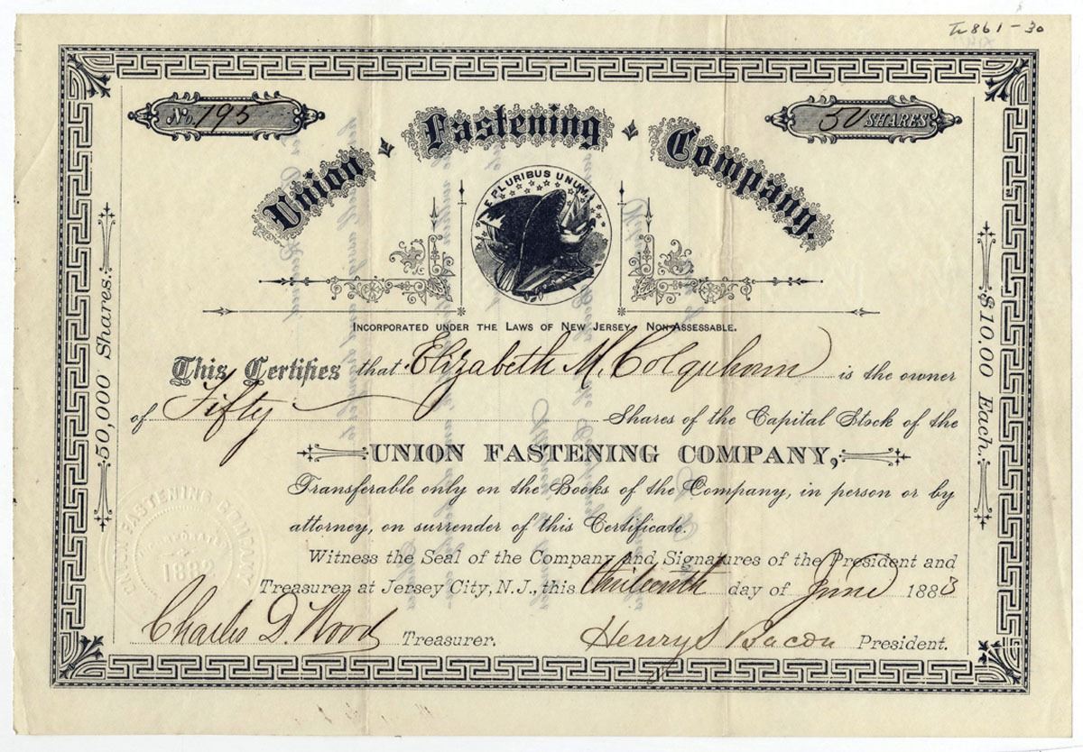 Jersey City, NJ. Union Fastening Co., 1883 50 Shares I/U Capital Stock Certificate, VF. Union Fastening Company was Chartered in New Jersey in 1882 and dissolved in 1884.