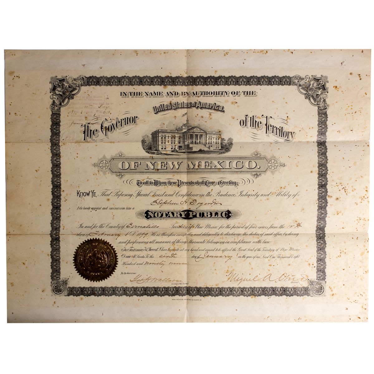 Territorial. Assignment of Stephen H. Bogardus to the position of notary public. Signed by the 16th governor of New Mexico, Miguel A. Otero. With vignette of the New Mexico State House at center. With large copper seal at left. Minor staining throughout. Bogardus is most famous for his war correspondence with the New York republican newspaper, The Eagle between 1861 and 1865 [valstar.net]. 21" x 16". - Vinegar Collection
