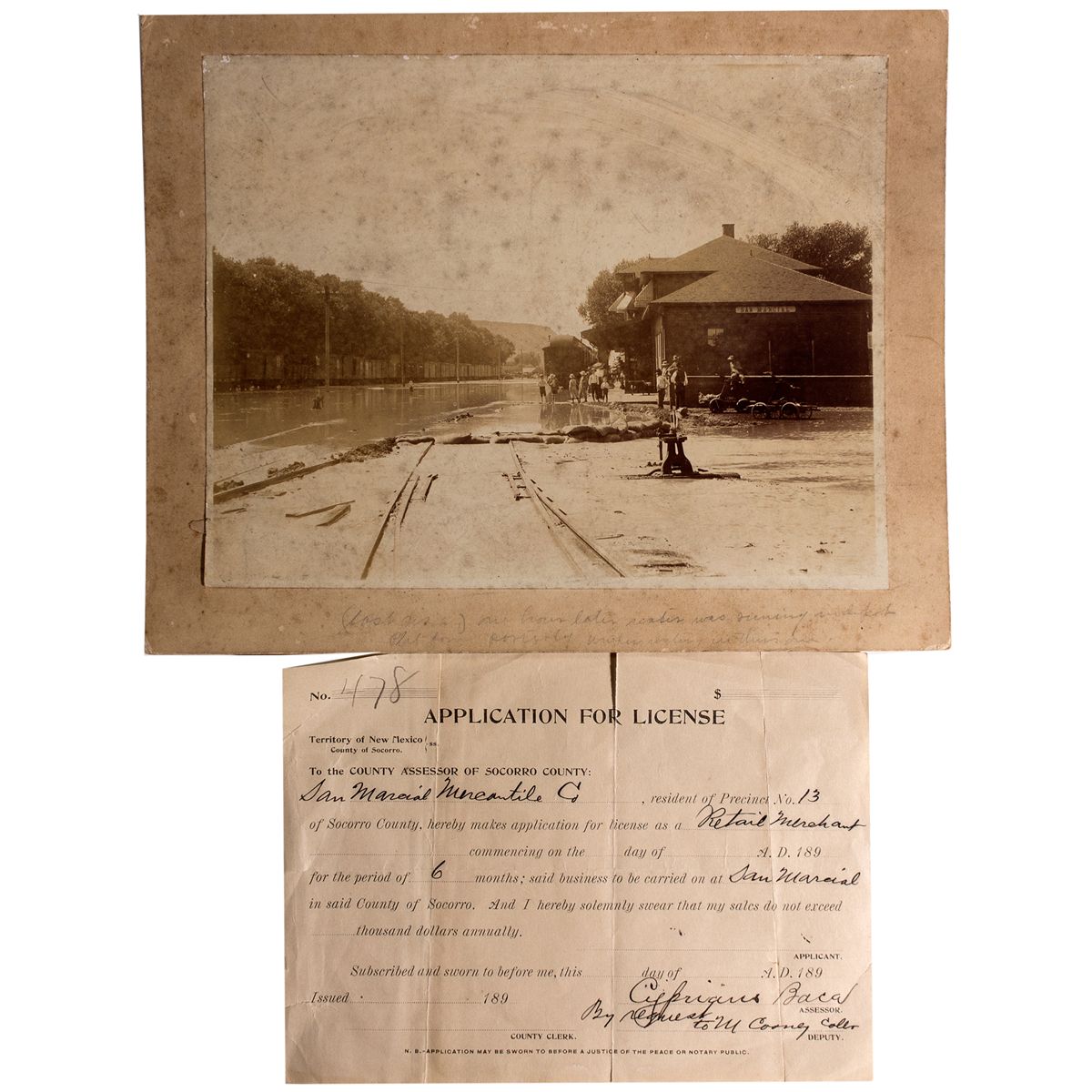 Lot of 2. 1) Photograph depicting the San Marcial flood. The flood of 1866 wiped out the first site of San Marcial and the town relocated to higher ground. With the coming of the railroad in 1880, the new site of San Marcial was again located. This photograph depicts the rising waters of the Rio Grande over the existing train tracks. In 1929, the newer site of San Marcial was lost completely [Pearce, T.M., 1965]. Photograph measures 8.25" x 6.5". Mounted on tan board with writing at bottom. Board measures 10" x 8". Staining at center. 2) Application for License (No. 478) issued to the San Marcial Mercantile Co. C1890s. Signed by Bacal, Assessor. - Vinegar Collection