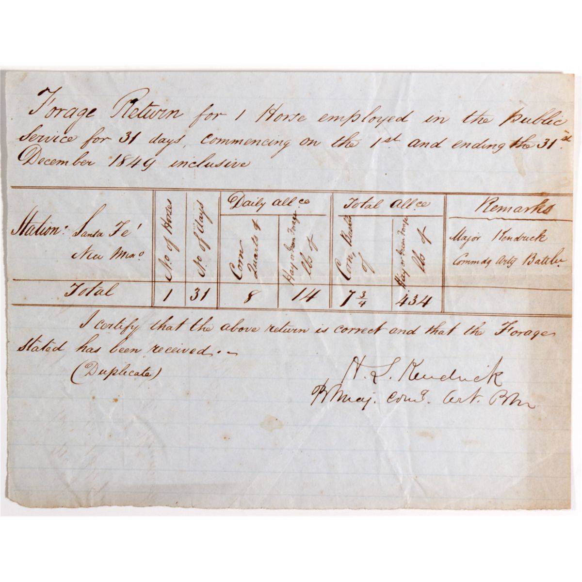 NM - Santa Fe,1849 - Return of Horse Document