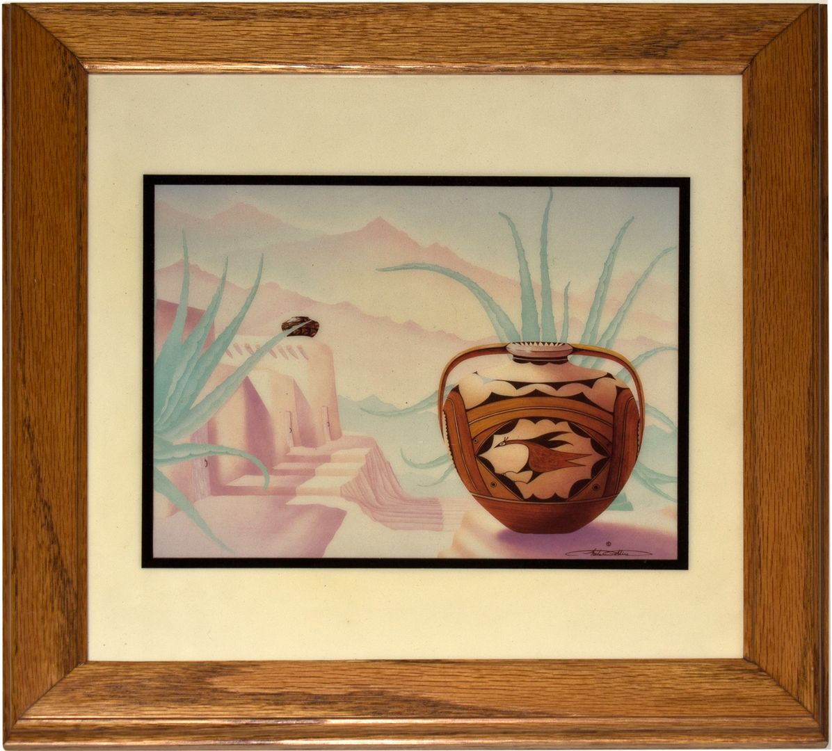 This is a painting on tile by Taos, New Mexico artist Charles Collins. It is part of his "Vessels of the Ancients" collection. Picture measures 7.5"x 9.5", with matting and frame, 14"x 14". This painting is vibrant, showing a pueblo as well as a piece of pottery from the New Mexico region.