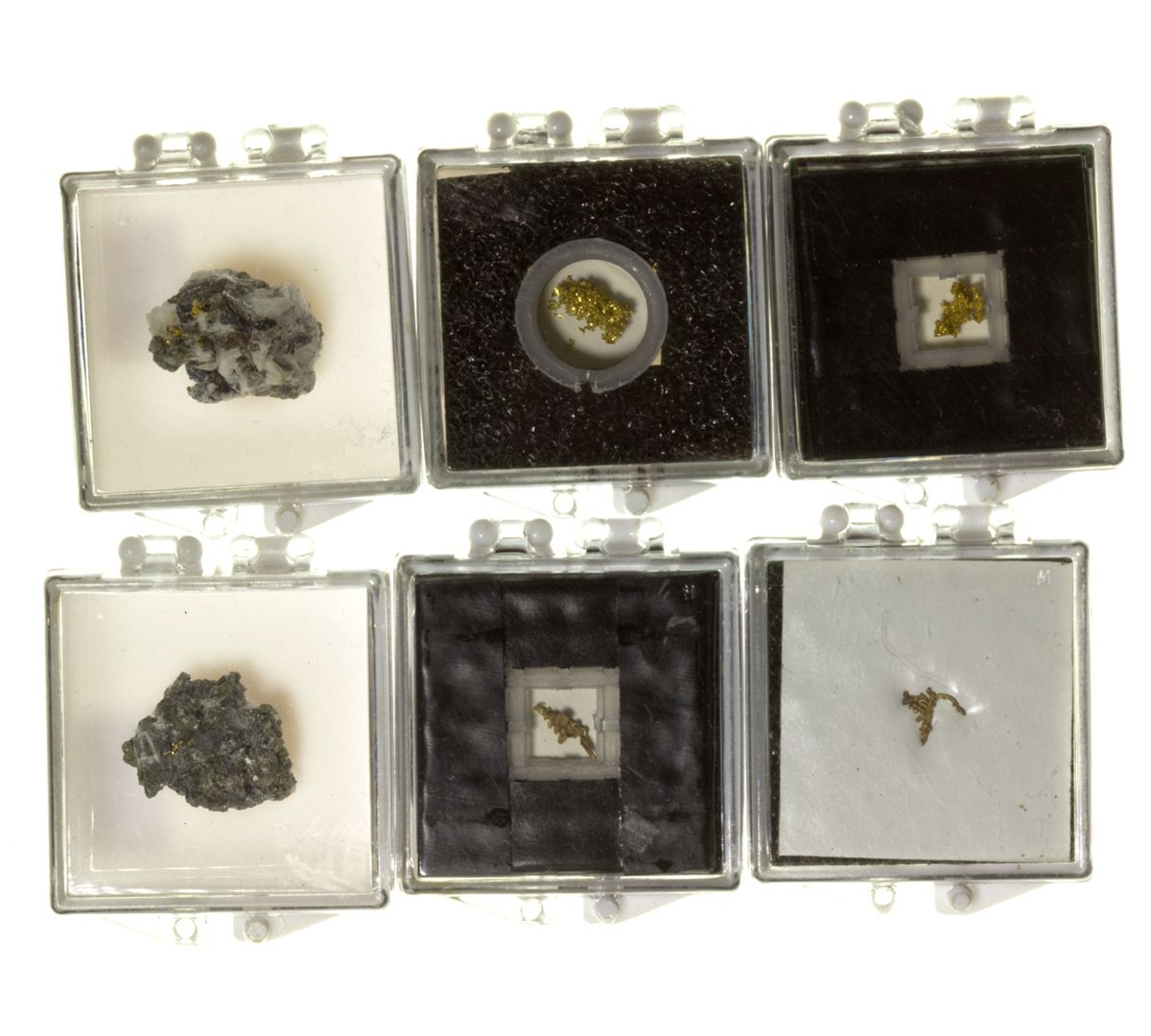 Lot of six specimens: Two gold specimens from Kelly Mine of Socorro County, New Mexico. Extremely rare and seldom-seen crystallized gold samples from this mine known to contain some of the best smithsonite specimens in the world. Two gold specimens from the American Mine of Nogal, New Mexico. Extremely rare and historic gold samples from this long-defunct New Mexico gold mine. Two specimens from the San Pedro mine. Each measures .5 across. Classic San Pedro specimens of wire gold growing on top of garnet skarn. Minor calcite association. All from an old collection, c1960s-1970s. HKA#63961