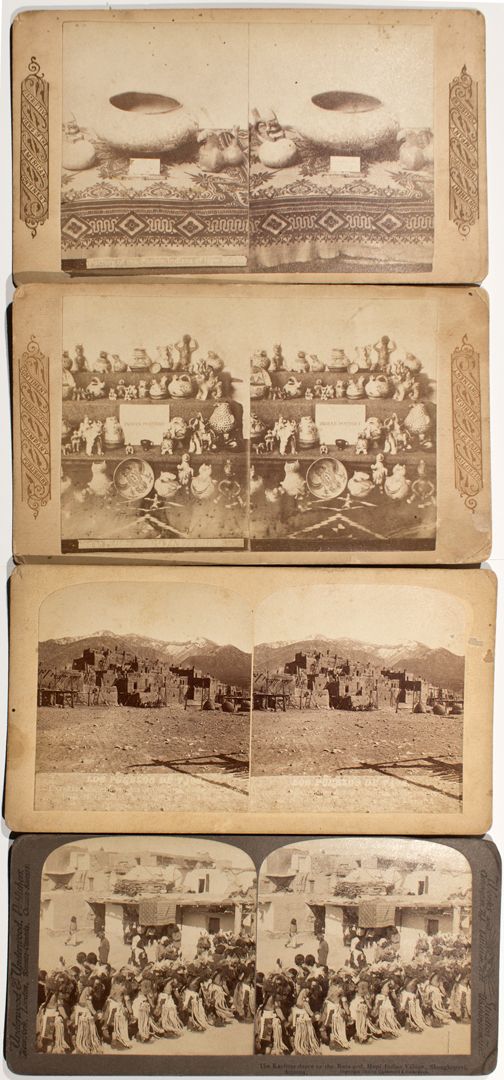 This lot includes 4 stereoviews of important native american cultural icons. 1) An image of Hopi dancers performing a Kachina dance to the rain god, in the traditional village of Shungopavi, Arizona. The image shows Hopi dancers dancing before Hopi pueblo dwellings. The image is copyrighted by Underwood Underwood of Arlington NJ, Littleton NH, and Washington DC. Excellent condition, clear and dynamic image. 2) An image of the Los Pueblos De Taos with a clipping on the back of the card that reads Gurnsey`s Rocky Mountain Views Published at Colorado Springs, Colorado. Pike`s Peak Avenue. and lists the image as No. 200 The Pueblos of Taos and includes a full description of the site (please preview in person to see this great description of the pueblos). Fine, clear image quality showing the structure of the pueblos and how they mimic the shapes of the mountains behind them. 3) An image of Indian Pottery by Continent Stereoscopic Company Publishers. The image shows four rows of native made pottery and figurines. Some fading on this image from Santa Fe, NM. 4) An image of Pottery of the Pueblo Indians of New Mexico. Shows one large vessel, and two kachina like vessels with figurines. Printed down the sides of the card: Discriptive [sic] Views of the American Continent. Very good condition. These stereoviews would make handsome additions to your native americana collections. HKA#63670