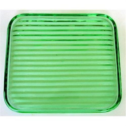 This green Depression glass perfume, vanity or dresser tray was produced by New Martinsville, marked in the middle, during the 1930s. Measures 9 1/4 x 8 1/4 inches. Featuring rounded corners, a ribbed pattern, fluoresces under black light, and is, with the exception of a couple of light scratches or straw marks, in excellent used condition.