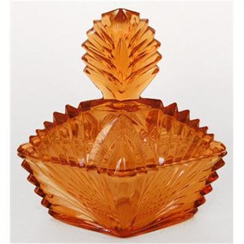 </font></strong>This amber Depression glass powder or dresser jar was produced by New Martinsville during the 1930s. Measures 6 x 4 inches x 6 3/4 inches tall. Featuring an Art Deco trapazoidal or diamond shape, contains the original puff and is in excellent condition.</font>