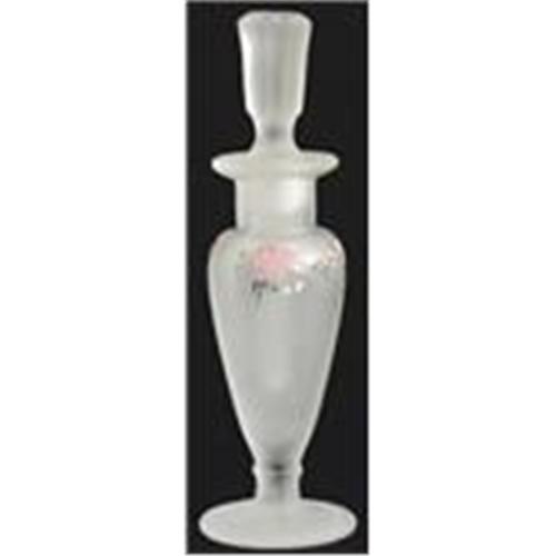 <table width="100%" border="0" cellspacing="0" cellpadding="4"><tr><td><em> </em></td></tr><tr> <td width="100%"> This lovely satin or frosted Depression glass perfume bottle, measures 5 1/2" tall, including ground stopper with dauber, and features hand painted floral decorations. Produced by the New Martinsville Glass Co. during the 1930s and with the exception of slightly worn enamel it is in excellent condition. This perfume bottle is part of a vanity set that includes a matching bottle and power jar that are available for sale in separate auctions </td></tr><tr> <td> </td></tr><tr> <td>Reference #: tsNMCSGVSPB2</td></tr><tr><td>Condition:Excellent</td></tr><tr><td>Year:1930s</td></tr><tr><td>Title:NMV Satin Depression Glass Perfume Bottle no2</td></tr><tr><td>Location:Orlando, Florida</td></tr></table>