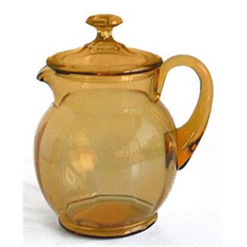 Produced by the New Martinsville Glass Co., circa 1930, this beautiful amber Elegant Depression glass covered 6 1/4" bedside pitcher, part of a guest set that included a tray and a tumbler. Rare to find not only with its lid but to find both the lid and pitcher in excellent condition