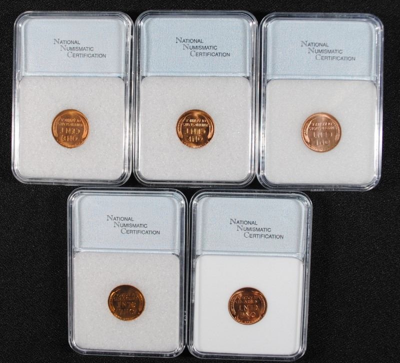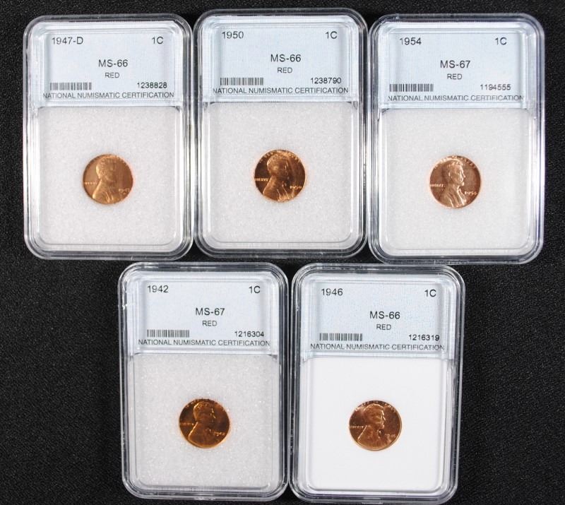 NNC GRADED SUPERB BU RED LINCOLN CENTS: 1942, 1946, 1947-D, 1950 & 1954