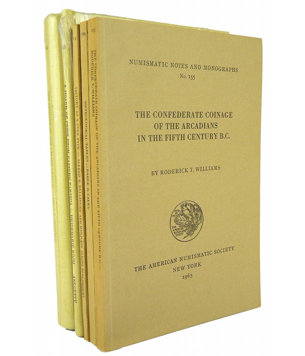 American Numismatic Society [publisher]. Williams, Roderick T. THE CONFEDERATE COINAGE OF THE ARCADIANS IN THE FIFTH CENTURY B.C. New York: ANS, 1965. 8vo, original card covers. Frontispiece map; xix, (1), 141, (1) pages; 14 fine plates. Cover fold; near fine. [with] Caley, Earle R. METROLOGICAL TABLES. New York: ANS, 1965. 8vo, original card covers. xi, (1), 119, (1) pages; 2 plates. Near fine. [with] Bellinger, Alfred R., and Marjorie Alkins Berlincourt. VICTORY AS A COIN TYPE. New York: ANS, 1962. 8vo, original card covers. (6), 68 pages; 13 fine plates. Fine. [with] Koch, Heidemarie. A HOARD OF COINS FROM EASTERN PARTHIA. New York: ANS, 1990. 8vo, original yellow cloth lettered in brown. x, 64, (2) pages; map; 12 plates. Fine. [with] Troxell, Hyla A. THE COINAGE OF THE LYCIAN LEAGUE. New York: ANS, 1982. 8vo, original cream cloth, gilt. Frontispiece map; xix, (1), 255, (1) pages; 44 plates. Fine. Numismatic Notes and Monographs, Nos. 155, 154, 149, 165, 162.