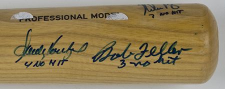 Rawlings Adirondack "Pro Ring" baseball bat signed by three Hall of Fame "No Hit Kings", all of whom have added the number of no-hitters they have pitched beneath their signatures, includes: SANDY KOUFAX (4), NOLAN RYAN (7), and BOB FELLER (3). With small brass plaque attached to bat with "double-sticky" tape. Fine.