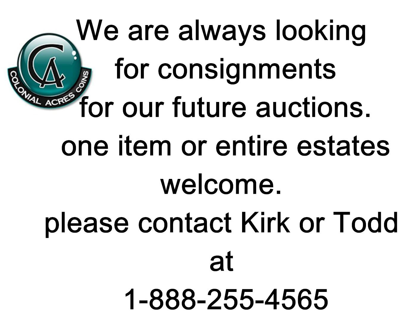 Colonial Acres Auctions will attempt to represent all items to the best of their knowledge. We cannot be held responsible for our opinion provided to you in this auction or the opinion of any third party grading services represented in this Auction. Grading is subjective to personal opinions; in many cases where Third party grading services are represented in our auction, these grades may differ from professional opinions, and thus we assume that all bidders have fully viewed the items in the auction and accept the condition represented prior to bid¬ding. We cannot accept responsibility and waive all liability resulting in financial losses, and or incidentals accruing from the sale of any items, nor can we guarantee that items graded by third party services will grade the same if submitted to a different grading service or re-submitted to the same company. Returns of items will not be accepted.